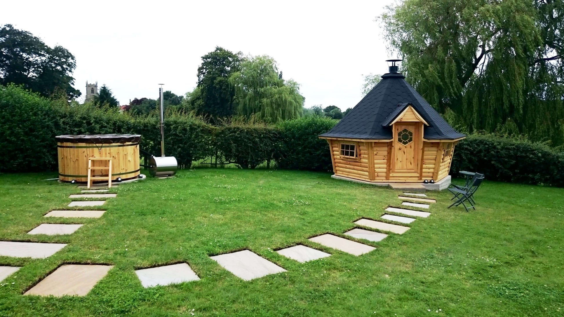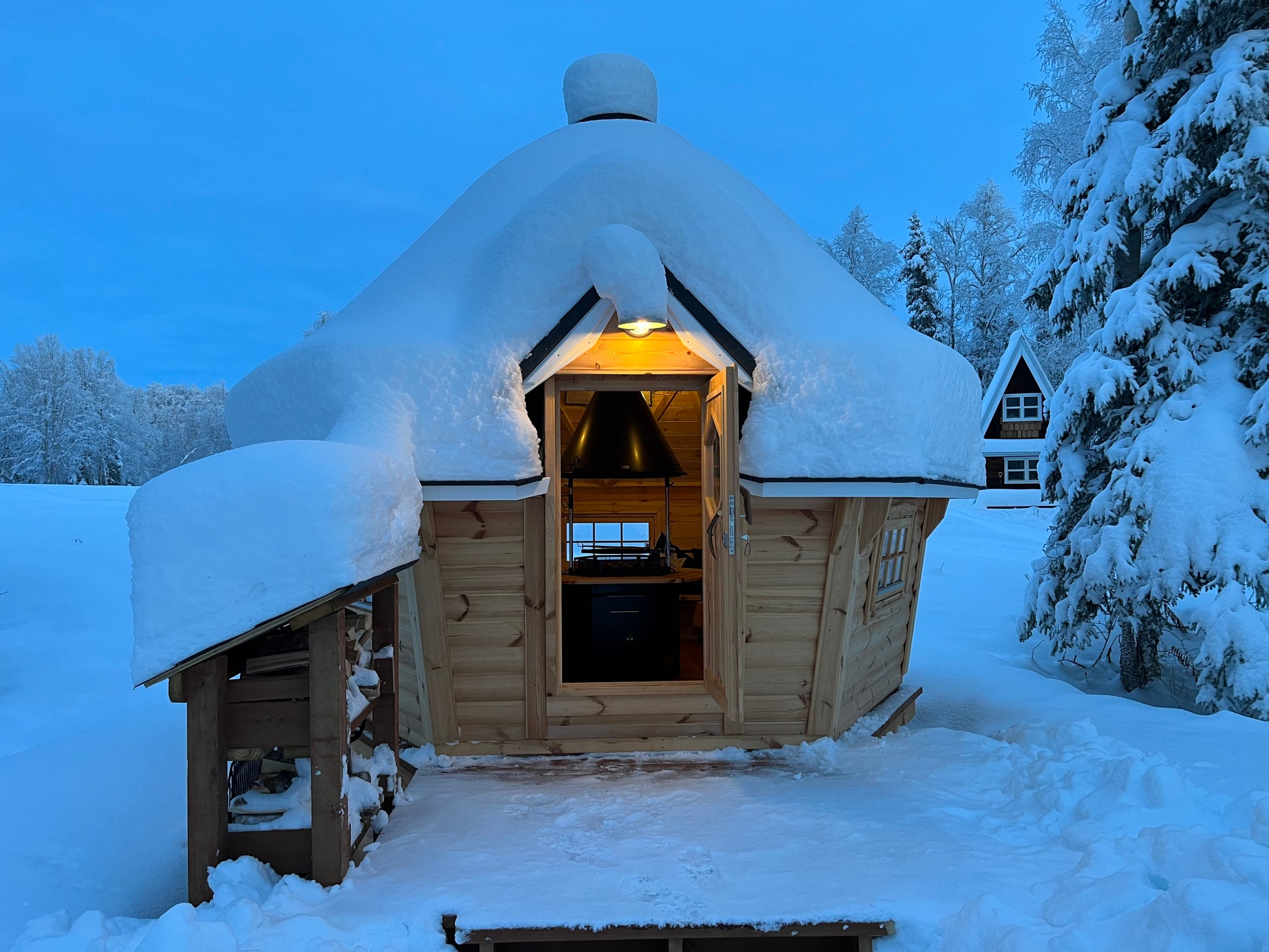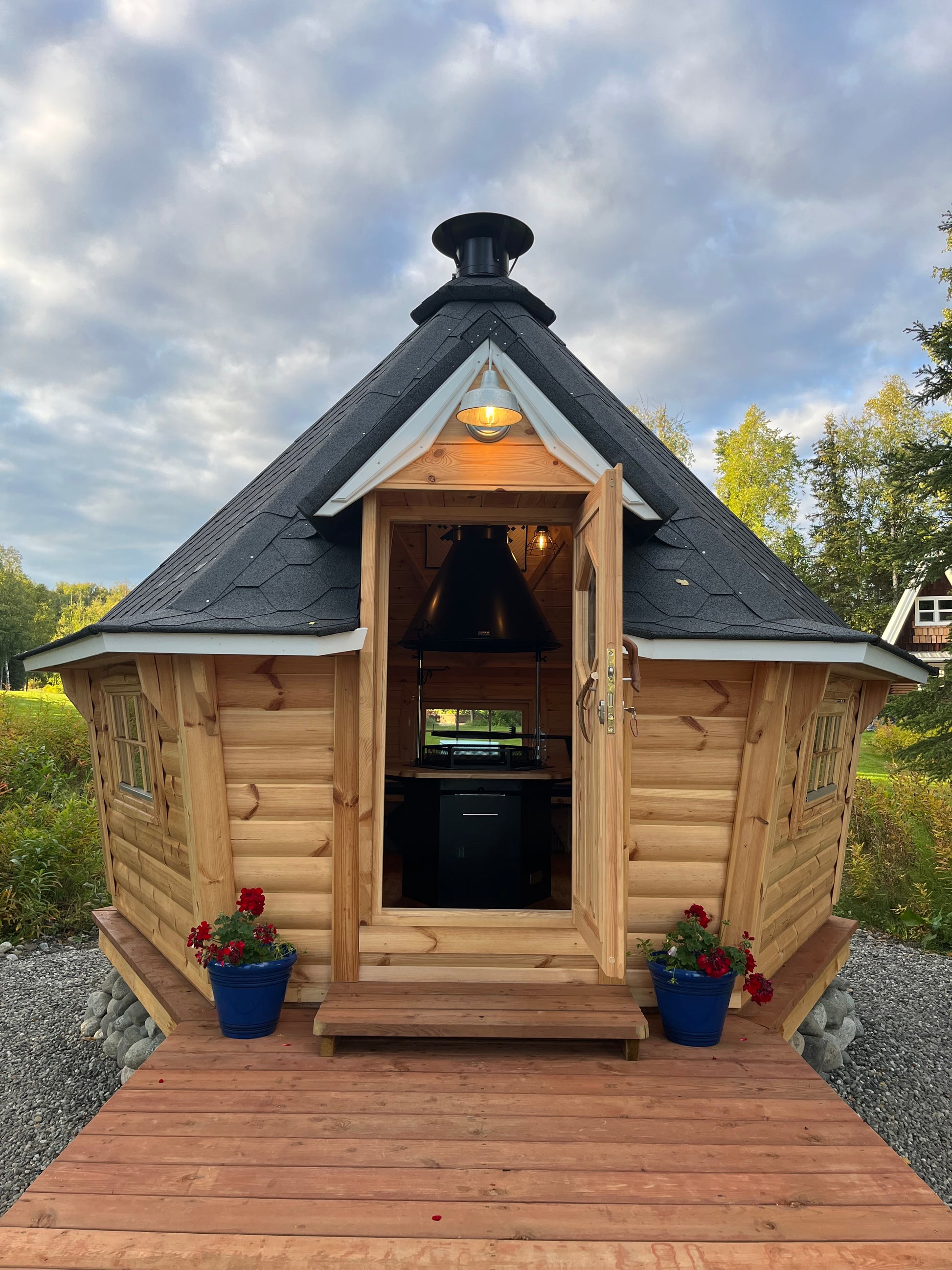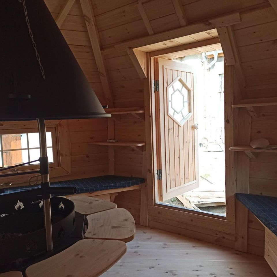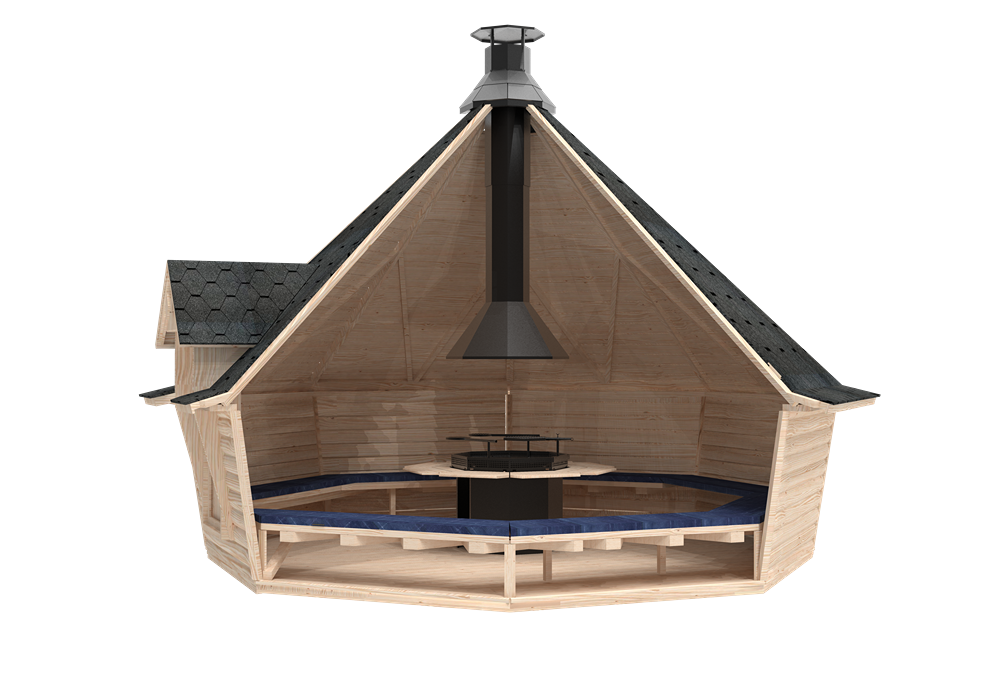 La cabine grill Kota Exclusive est la hutte en bois finlandaise la plus traditionnelle disponible. Avec ses murs élégamment inclinés, l'Exclusive intègre notre grill Kota chauffé au bois Polar Grilli M6 avec une cheminée au centre, entourée de tables. Également connu sous le nom de 'grillikota', ce type de structure trouve ses origines dans le nord arctique de la Finlande. Restez confortablement au chaud autour d'un feu de bois en toutes saisons.