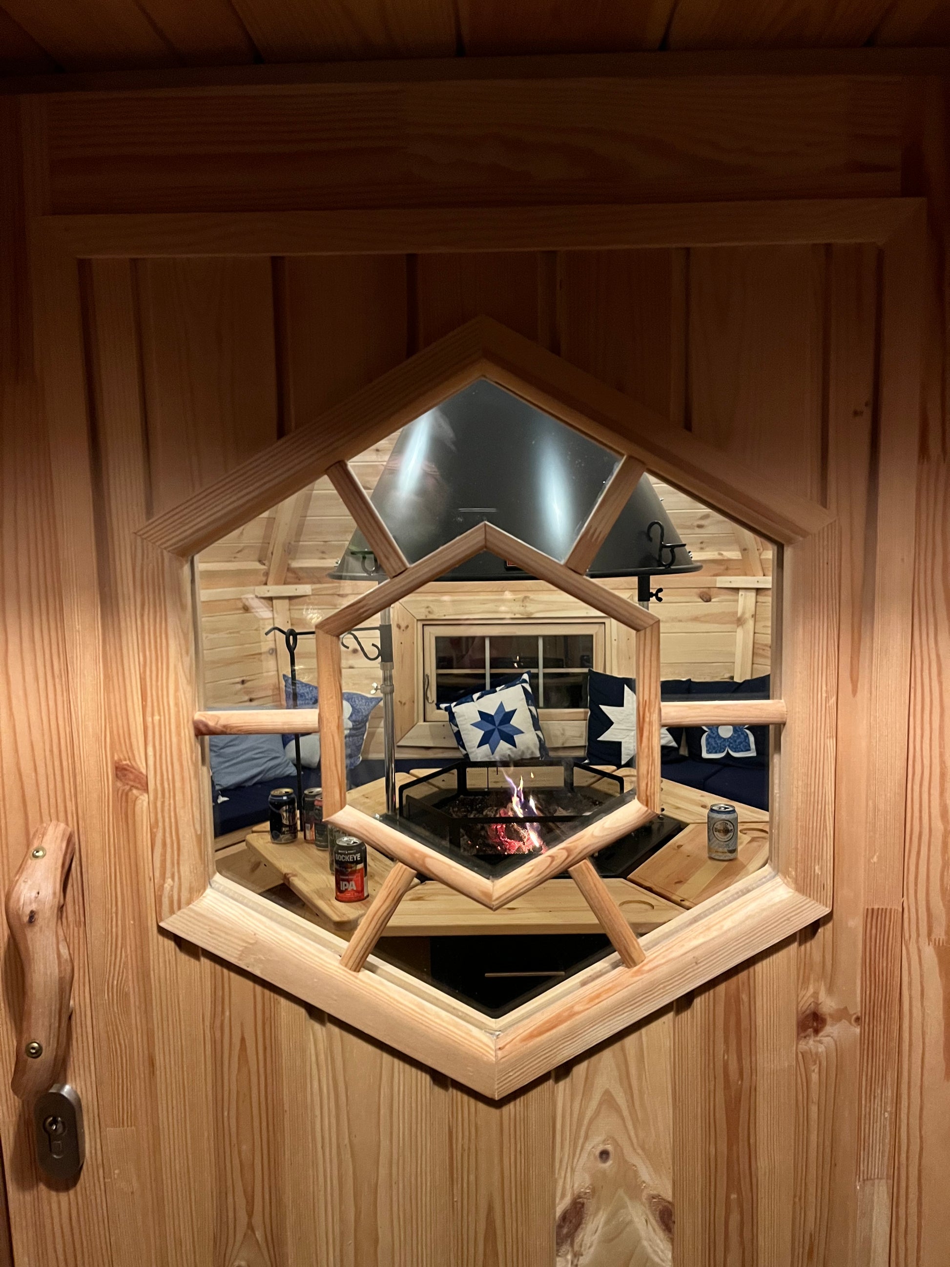 - Porte avec fenêtre hexagonale à double vitrage, poignée en bois et verrou